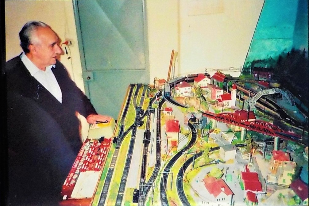 Due rarissime foto a colori dell'ultimo plastico di Aurelio Galeppini. Le foto risalgono presumibilmente al 1991. Si notano, grazie al colore e ad una ripresa più ravvicinata, molti edifici in scatola di montaggio tra cui gli allora nuovissimi Edilmec CO-MA e i britannici Airfix. Aurelio Galeppini è al banco di comando, intento a manovrare il piccolo convoglio dalla grande locomotiva che ha appena oltrepassato il ponte centrale del plastico. In alto a dx si intravvede la spalliera contenitore del plastico, dissimulato in un finto divano, con dipinto un paesaggio alpino.