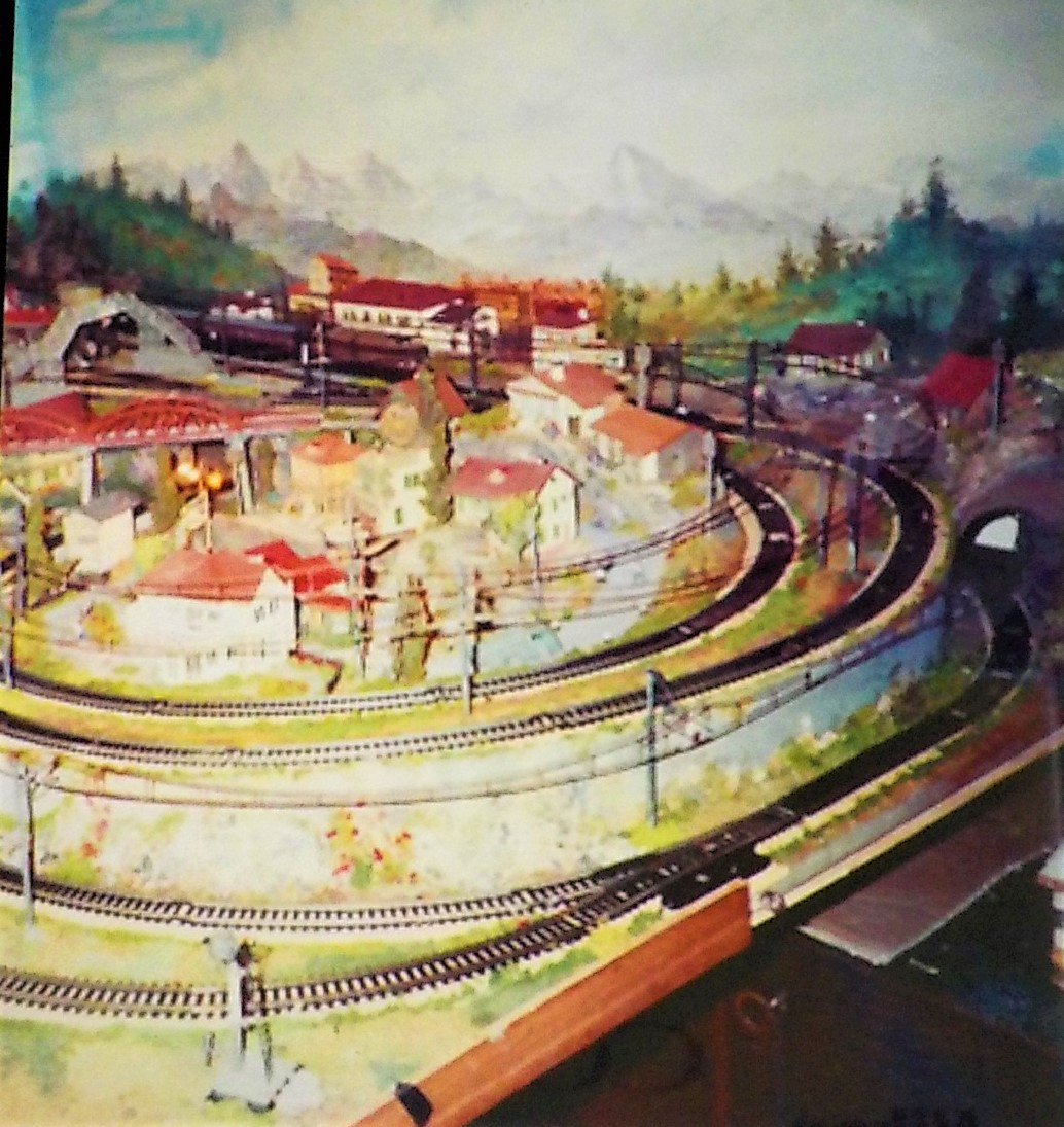 Il plastico in posizione aperta. Il piano di appoggio dei binari, piuttosto basso, è forse il punto debole del piccolo impianto. Da notare la deliziosa decorazione del fondale: monti in lontananza, cielo che dona la giusta profondità all' impianto, il tratto pittorico solido e maturo. La particolare configurazione del plastico, dato il poco spazio disponibile in altezza, non permetteva che un tracciato a semplice anello. La stazione, per poter essere ragionevolmente lunga, si trovava nell'area centrale del tracciato, con il difetto che i treni potevano uscirne solo a marcia indietro.