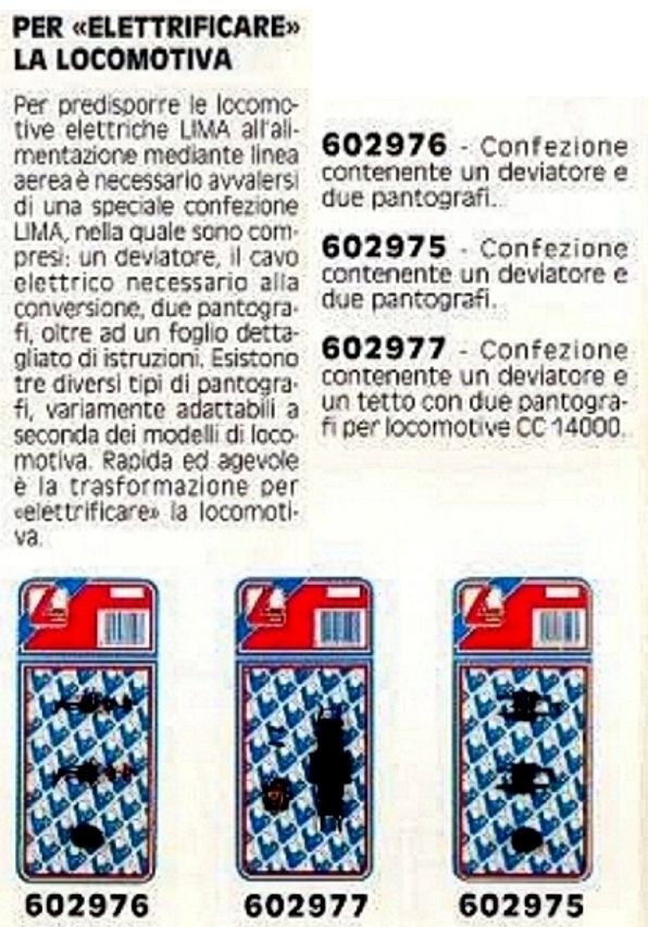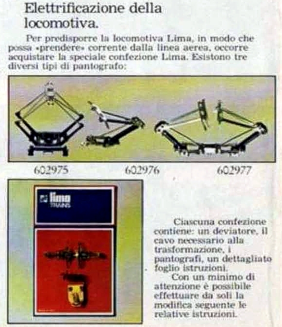 Fin dal 1978 vengono proposti anche pantografi in grado di alimentare il motore delle locomotive, che fino ad allora montavano pantografi non adatti allo scopo. Vengono presentate tre confezioni, per sostituire i tre pantografi allora in uso sulle loco Lima