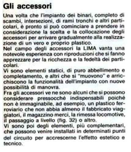 Dotare i tracciati ferroviari in miniatura di fabbricati e accessori è una necessita per ogni plasticista. Lima fin dal primo catalogo del 1959 presentava alcuni accessori: una stazione, un casello e una galleria, tutti in gomma. Negli anni '60 la proposta di accessori, principalmente edifici, resta limitata come produzione propria ed è per la maggior parte affidata a ditte esterne come Ferroplastik. Abbandonati i fabbricati di ditte terze (nel 1968 circa), Lima inizia a presentare materiale di propria produzione, prima con moderazione, ma dal 1973 e per tutti gli anni '70 con continue proposte di nuovi edifici, accessori e rotabili su gomma. Molti dei quali in catalogo fino al 2000. Alcuni ingenui e giocattoleschi, altri più realistici e adatti ad un plastico da adulti.