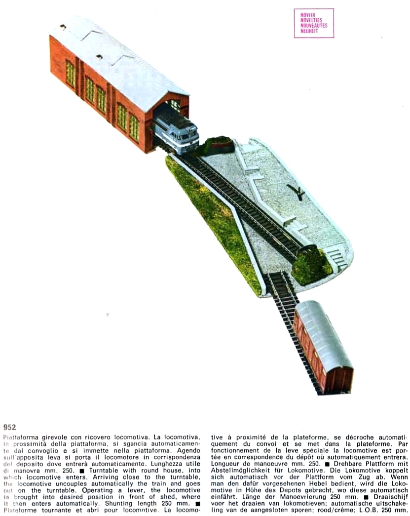 Nel catalogo 1973/74 viene proposta la piattaforma girevole con ricovero locomotiva. In verità la piattaforma è "semi" girevole. A un certo punto sulle confezioni viene definita "smistatore"