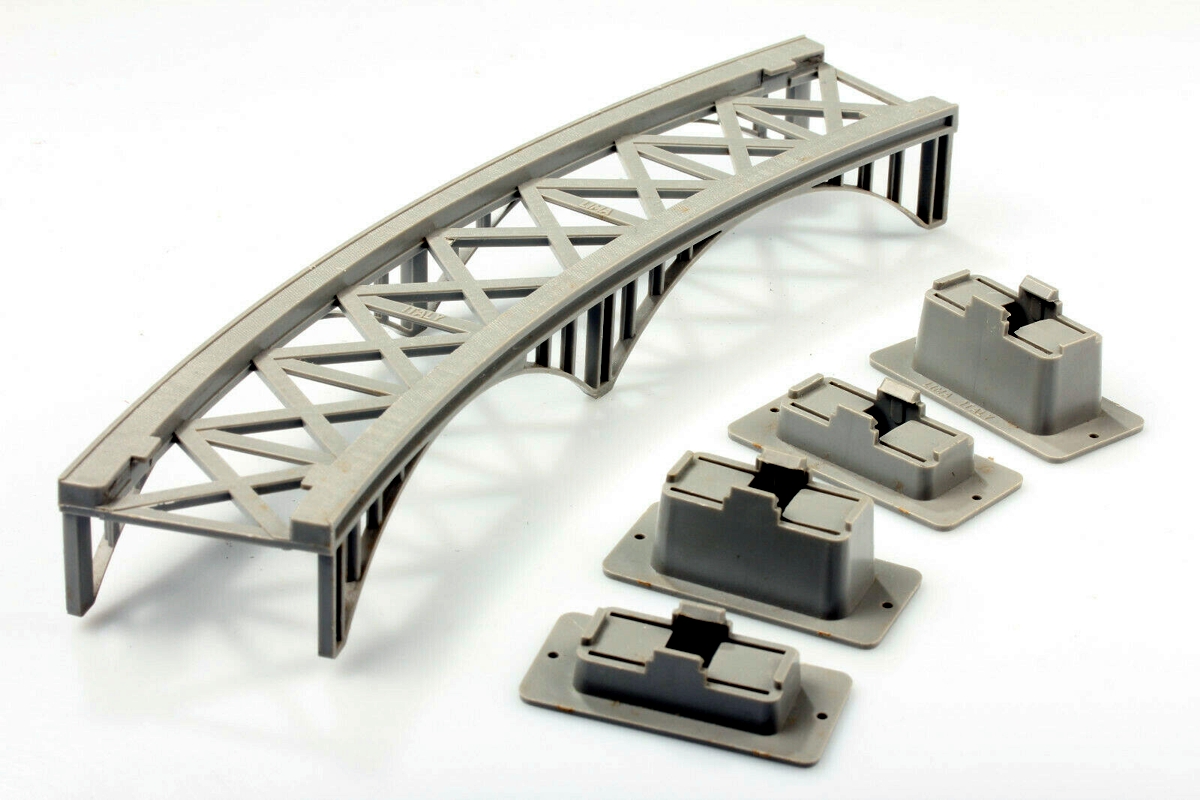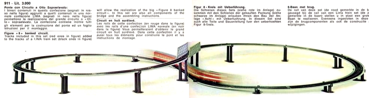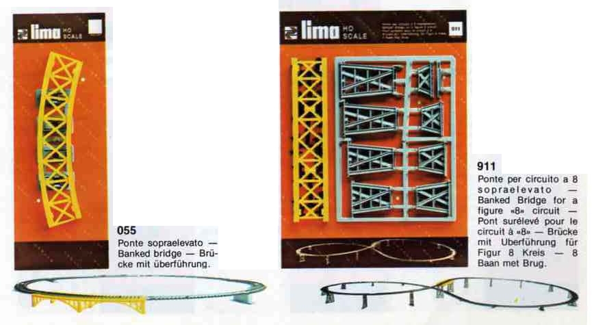 Nel 1975 viene presentato il ponte in curva art. 055, mentre la confezione art. 911 ha perso i binari e contiene solo il ponte e i pilastri