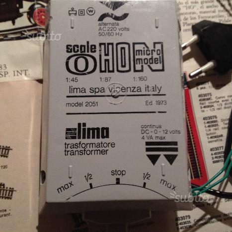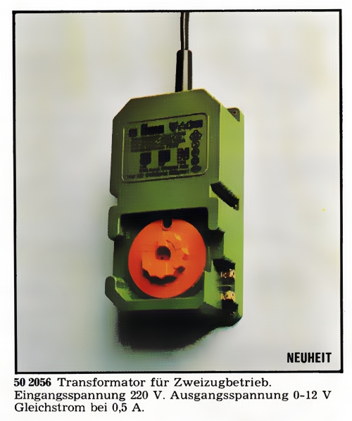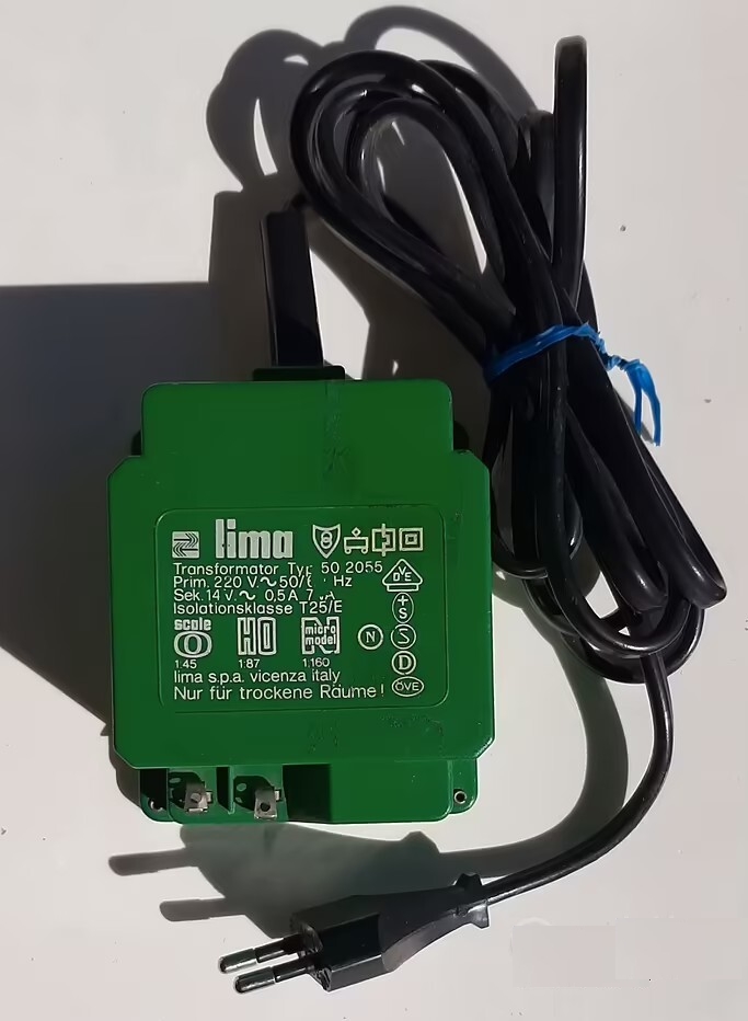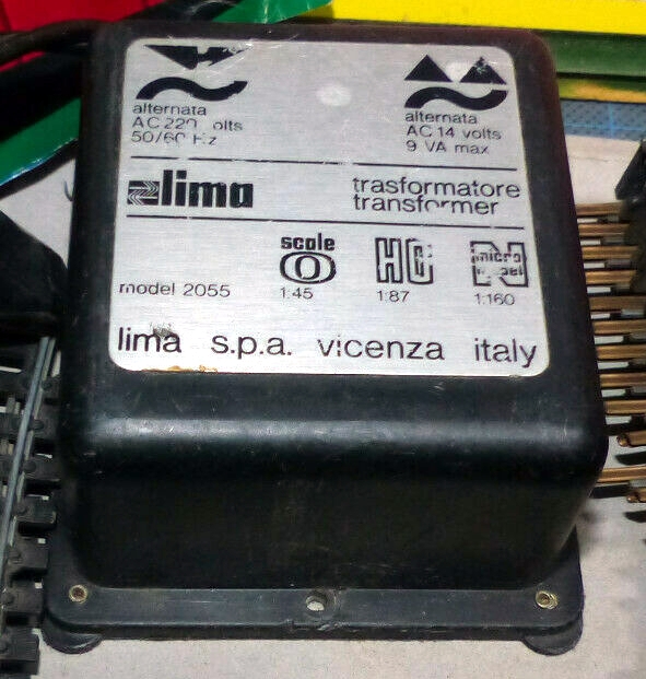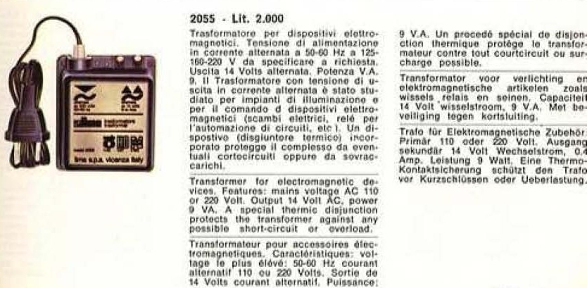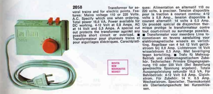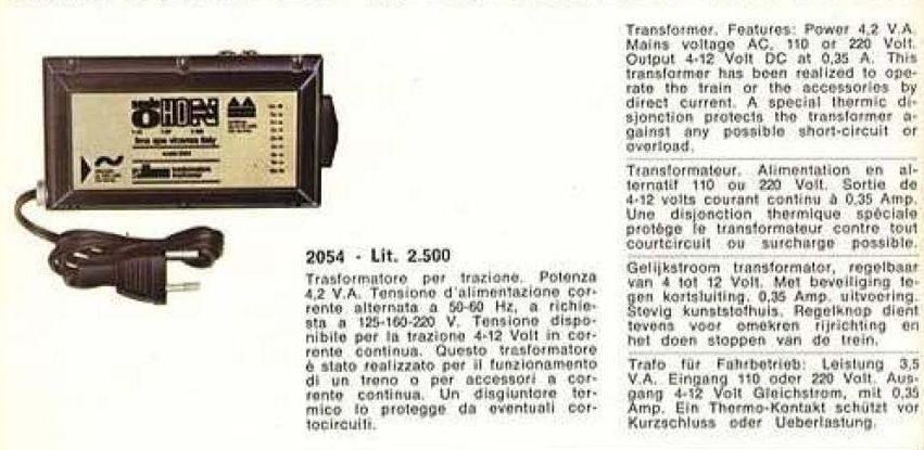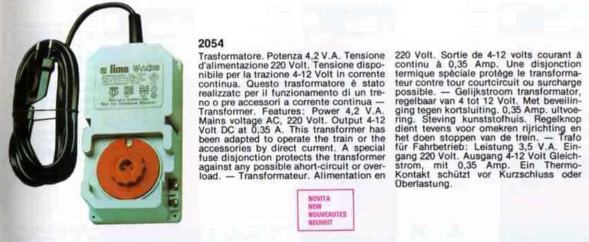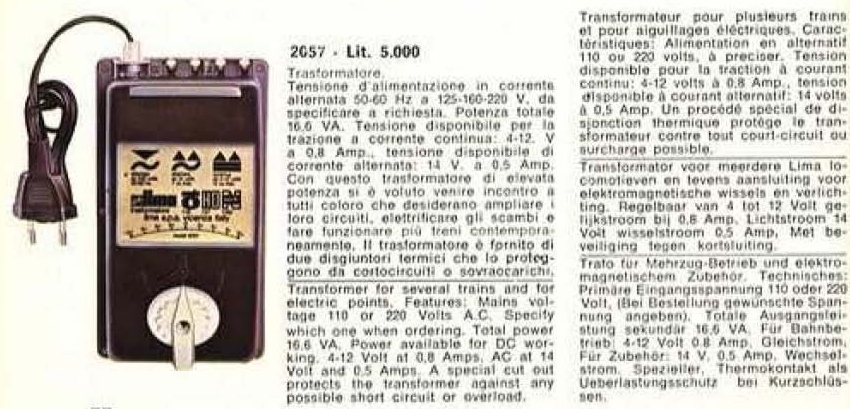 Trasformatore 50-2057 con uscita in CC e CA dal 1978 al 1981 Trasformatore 50-2059 con uscita in CC (per più treni) e CA dal 1978 al 1983 Dal catalogo 1979 con il nuovo logo Lima Models