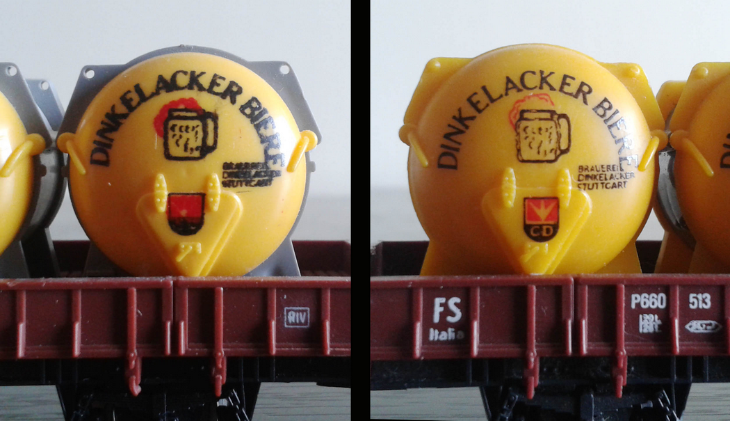 Entrando nel dettaglio della riproduzione Lima, possiamo subito osservare che, per quasi tutte le colorazioni, sono state realizzate due varianti di forma dei contenitori. La prima, più aderente alla realtà, aveva i montanti strutturali con i fori per il sollevamento dei contenitori. La seconda variante costituiva quella “economica”: qui al posto dei fori troviamo delle bugne a rilievo.