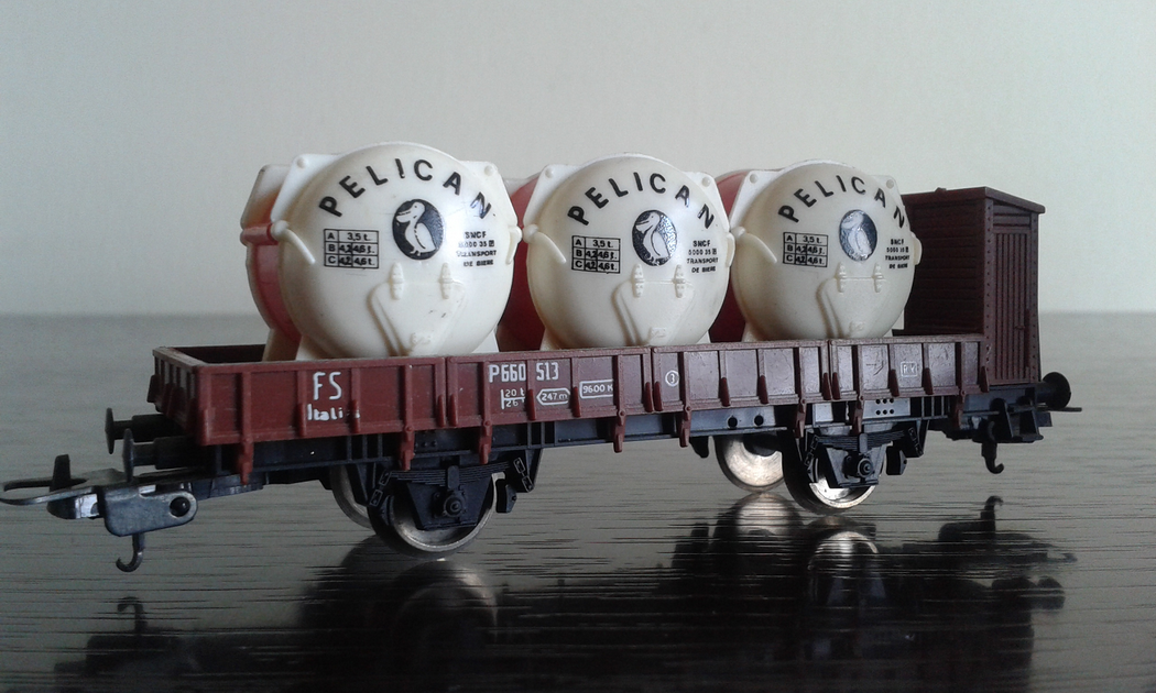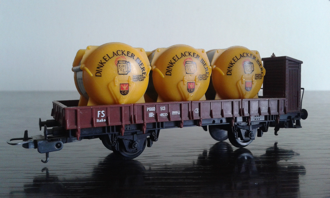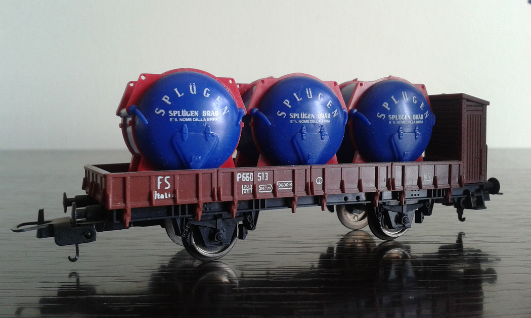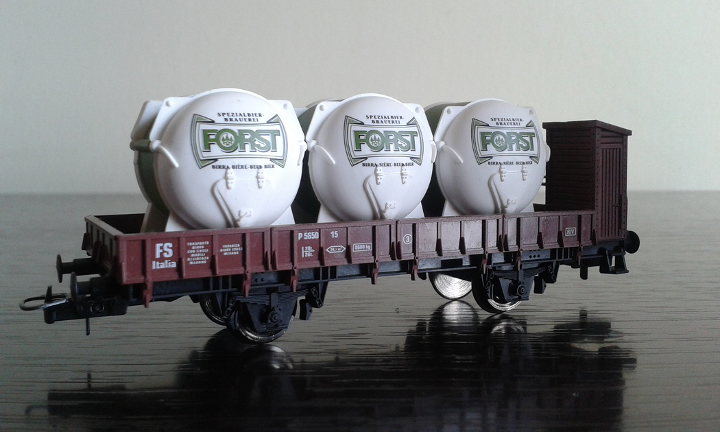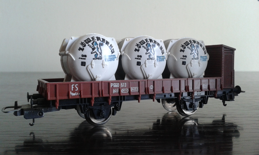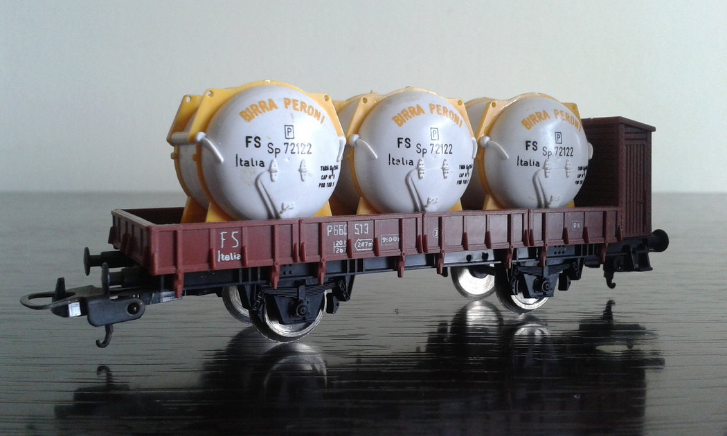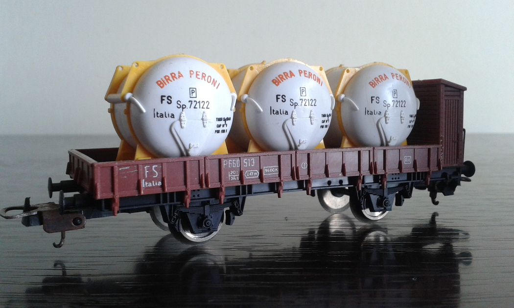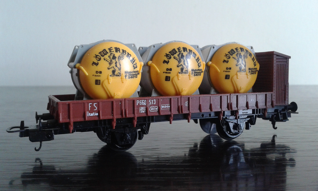 Parlando di vagoni merci, uno dei cavalli di battaglia della Lima è da sempre stato il carro “P” a due assi, il pianale per eccellenza della Casa vicentina. Sin dagli anni settanta, è stato commercializzato sia vuoto, sia con i carichi più disparati: tubi, casse mobili refrigerate, botti per trasporto vino, rotoli di lamiera e contenitori per trasporto birra. In particolare, è sempre stata quest’ultima variante a colpire il mio interesse, non foss’altro che per le molteplici livree in cui questo carro è stato proposto.