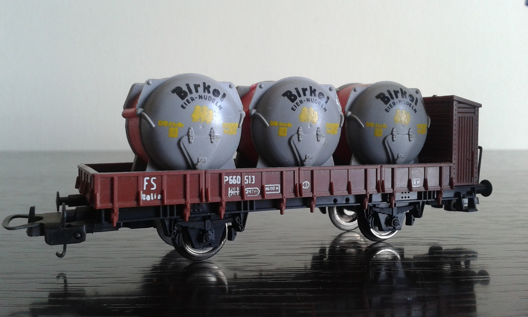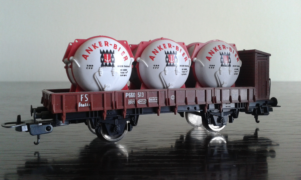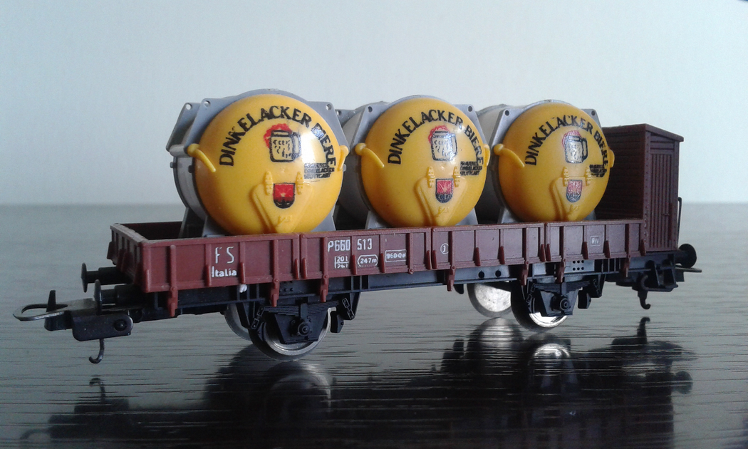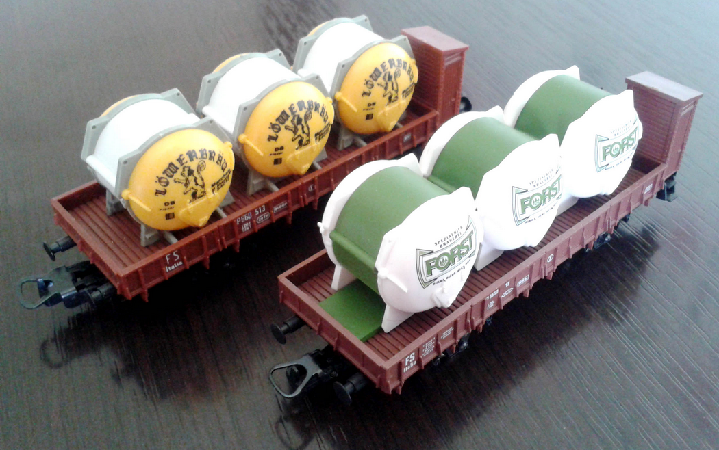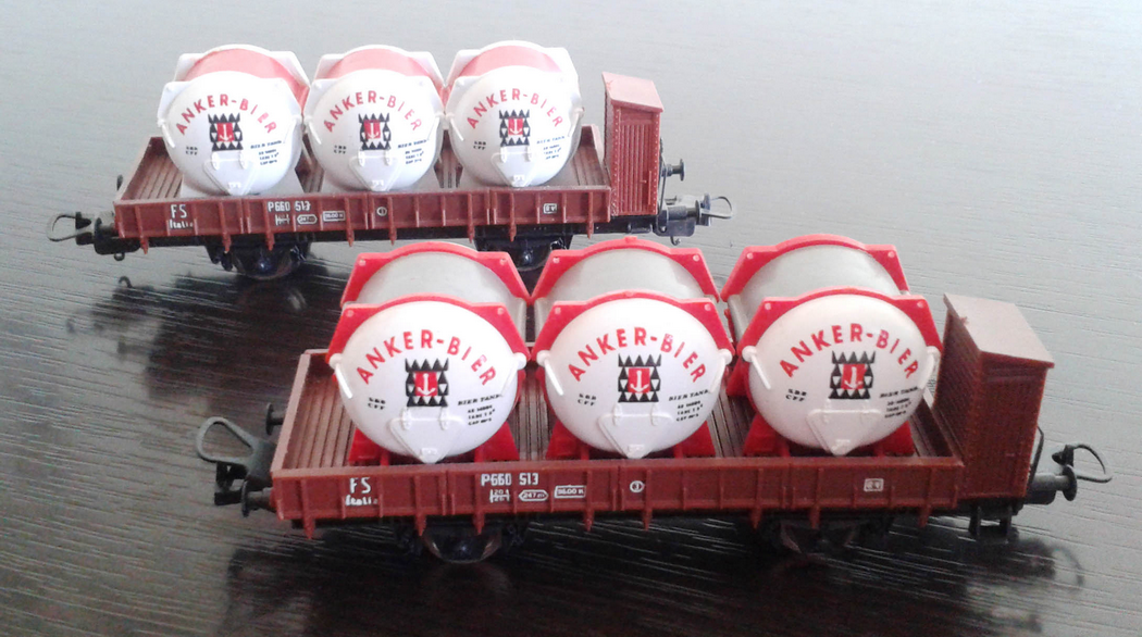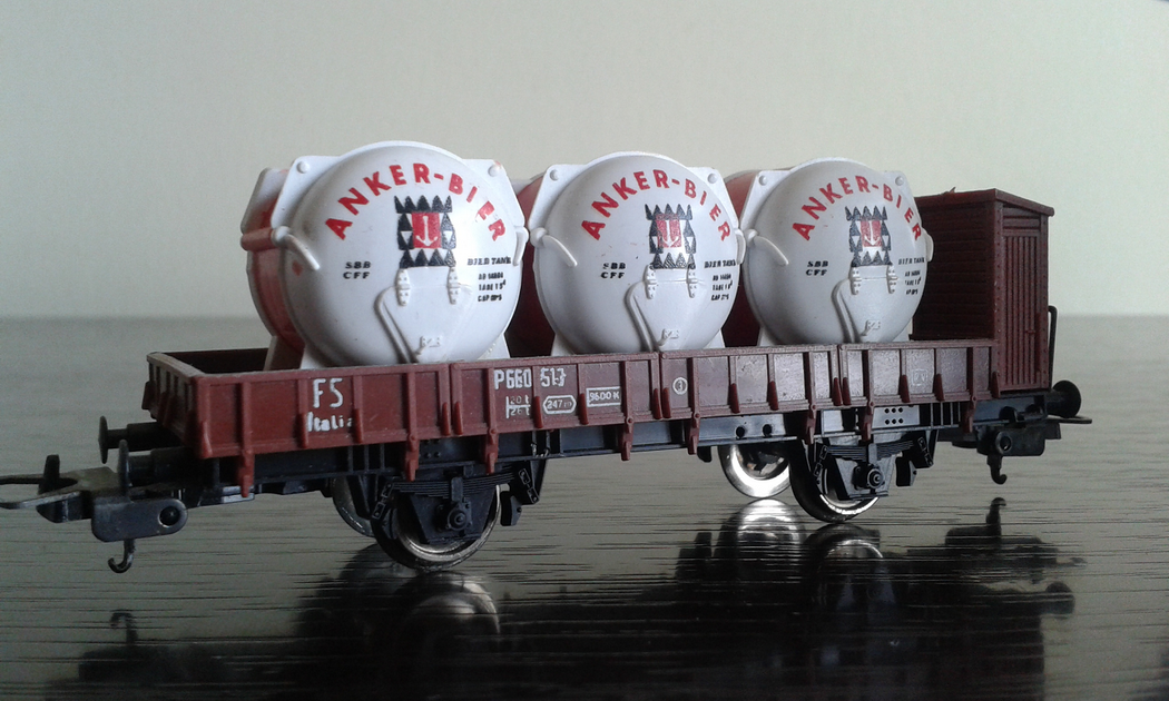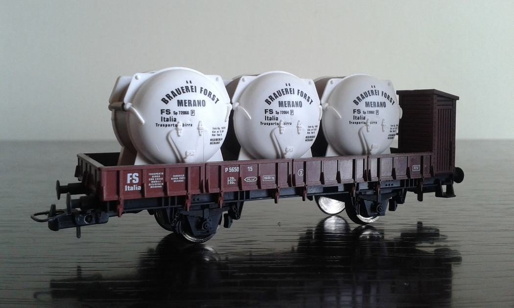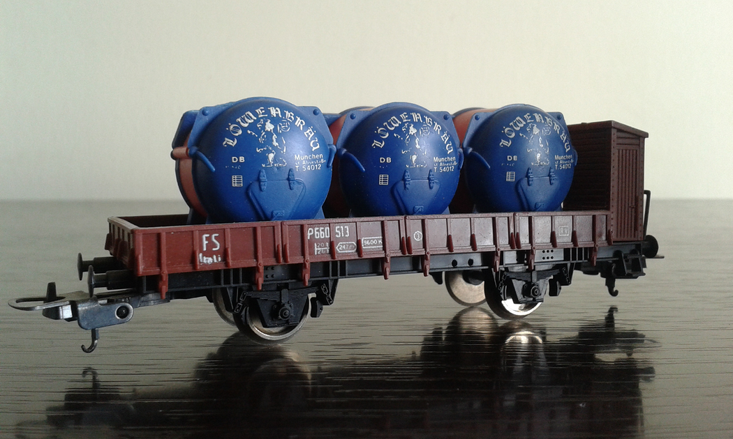 Parlando di vagoni merci, uno dei cavalli di battaglia della Lima è da sempre stato il carro “P” a due assi, il pianale per eccellenza della Casa vicentina. Sin dagli anni settanta, è stato commercializzato sia vuoto, sia con i carichi più disparati: tubi, casse mobili refrigerate, botti per trasporto vino, rotoli di lamiera e contenitori per trasporto birra. In particolare, è sempre stata quest’ultima variante a colpire il mio interesse, non foss’altro che per le molteplici livree in cui questo carro è stato proposto.