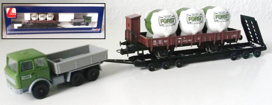Nel catalogo “novità 2002” fa la sua effimera comparsa l’articolo L600811, un cofanetto contenente, insieme al carro merci con contenitori, una motrice stradale FIAT a tre assi ed un carrello stradale, entrambi adattati attingendo dagli storici accessori da anni prodotti dalla Casa vicentina. Il logotipo della birra Forst di foggia moderna (assai ben tampografato) non era mai stato utilizzato in precedenza. Purtroppo, nel catalogo dell’anno successivo, già non si aveva più traccia di questo bel complesso.