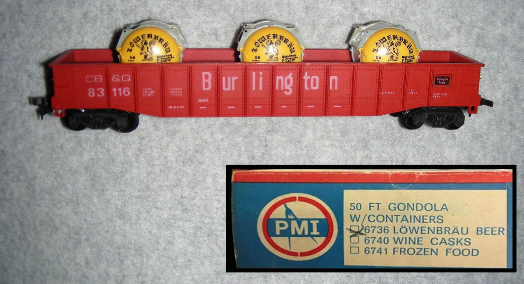 A completamento della panoramica su carri Lima trasporto birra, non possiamo non citare lo strano caso del carro americano Burlington (tipo “gondola”) commercializzato dalla PMI. Questo “sponde alte” americano assomiglia in tutto a quello di normale produzione Lima, così come i tre contenitori in esso presenti sono identici a quelli dei carri P di normale produzione. Non saprei affermare con certezza la genesi dell’improbabile connubio carro americano + fusti birra. Di sicuro si sa che questo vagone non è mai stato commercializzato in Italia e, pertanto, a tutt’oggi resta una rarità per collezionisti