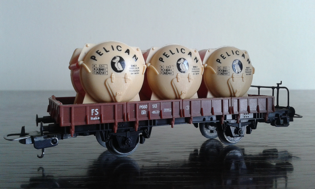 In particolare questi contenitori avevano, integrati nella struttura metallica, quattro occhielli per il loro sollevamento e due tubi disposti orizzontalmente (uno per lato) entro i quali passavano le catene per l’ormeggio sui carri merci o sui pianali degli autocarri. Quest’ultimo particolare risulta purtroppo solo accennato nei modelli lima, mentre le catene sono state completamente omesse, anche in virtù della destinazione giocattolesca del carro.