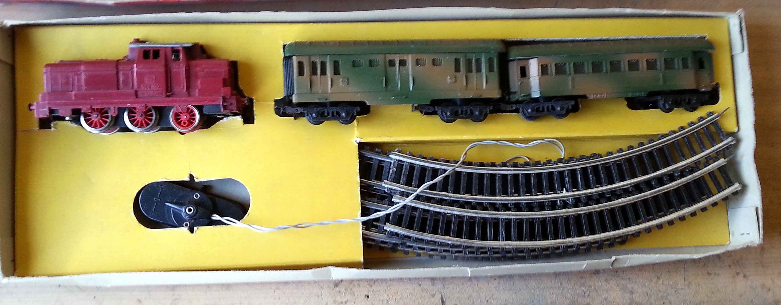 In questa sezione vorrei presentare il set di avvio classico che Lima ha proposto dal 1978/79 fino ai primi anni ’90. Il set comprendeva una locomotiva V188 mimetica del primo tipo, una carrozza passeggeri mimetica tipo Az 23.000 molto semplificata, un vagone aperto a sponde alte tipo St, un vagone chiuso Gs e un cannone ferroviario Leopold che descriverò meglio nella loro sezione perché erano venduti anche singolarmente.