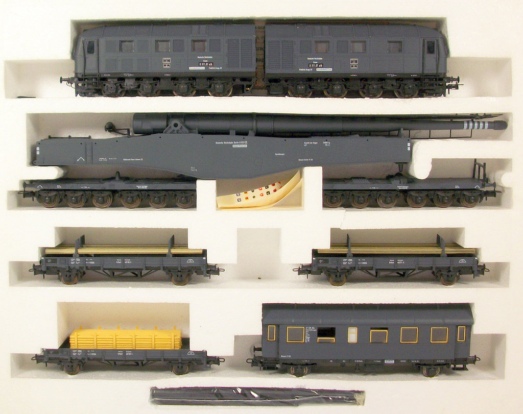Il set classico sembra sia uscito anche con la locomotiva a vapore Alco in livrea mimetica. Ho trovato diverse inserzioni da venditori diversi e in periodi diversi quindi non credo si tratti di un’elaborazione. Mi sembra superfluo affermare che la locomotiva non è mai esistita nella realtà e appare inoltre molto improbabile con un aspetto tipicamente americano in servizio nella Wehrmacht.