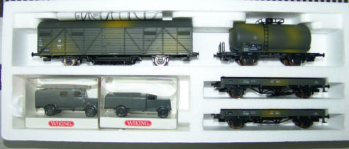 Set militare mimetico con un vagone pianale a sponde basse lungo tipo SSoS e un vagone aperto a sponde alte lungo tipo OOfs. Interessante il carico di un generatore prodotto appositamente per il set. Per il mercato tedesco sono inclusi anche due mezzi Wiking: un Hanomag HD5N e una Horch. Non ho trovato il set su nessun catalogo in mio possesso ma sembra sia stato prodotto solo per un anno, il 1998. Set molto bello e plausibile.