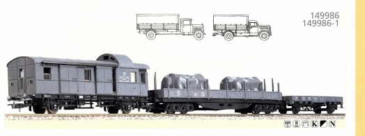 Set in livrea grigio scuro che contiene un bagagliaio con le porte scorrevoli e un carico riprodotto all’interno, un vagone pianale a sponde basse lungo tipo SSoS e un pianale a sponde basse corto tipo KLM 505. La versione per il mercato tedesco contiene anche due mezzi Wiking: un Mercedes Benz L 2500 (diverso da quello presente sul set L149796-1 e con il carico telonato) e un Opel Blitz 1939. Oltre ai mezzi presenta anche il carico mimetico. Il set appare per la prima volta sul catalogo del 2000 novità con un prototipo che ha il carico con una mimetica raffinata e non presente nel set in commercio. Verrà prodotto fino al 2004. Un altro prototipo appare nel catalogo del 2001 con un carico mimetico diverso da quello del modello in commercio grigio. La versione con i mezzi sembra sia stata prodotta per un anno solo il 2000. Set in definitiva plausibile e molto bello soprattutto la versione con i mezzi.