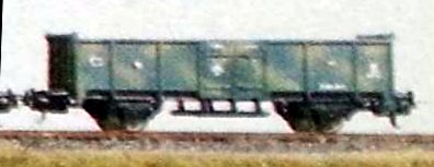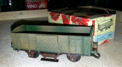 2103/M Modello ricavato dal vagone chiuso di tipo F accorciato togliendoli semplicemente la parte superiore. Sembra sia stato prodotto solo nel 1959 e forse primi anni ’60. Sul catalogo del 1961 appare questo modello con i ganci ad occhiello ma non ho prove della sua effettiva esistenza ed è più probabile che abbiano usato il modello più moderno.