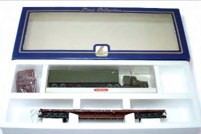 Pianale con caricato un tir Lima. Anche questo modello appare per la prima volta sul catalogo del 2000 novità con un camion più rifinito e con un pianale marrone. Il modello in commercio rimarrà in produzione fino al 2004.