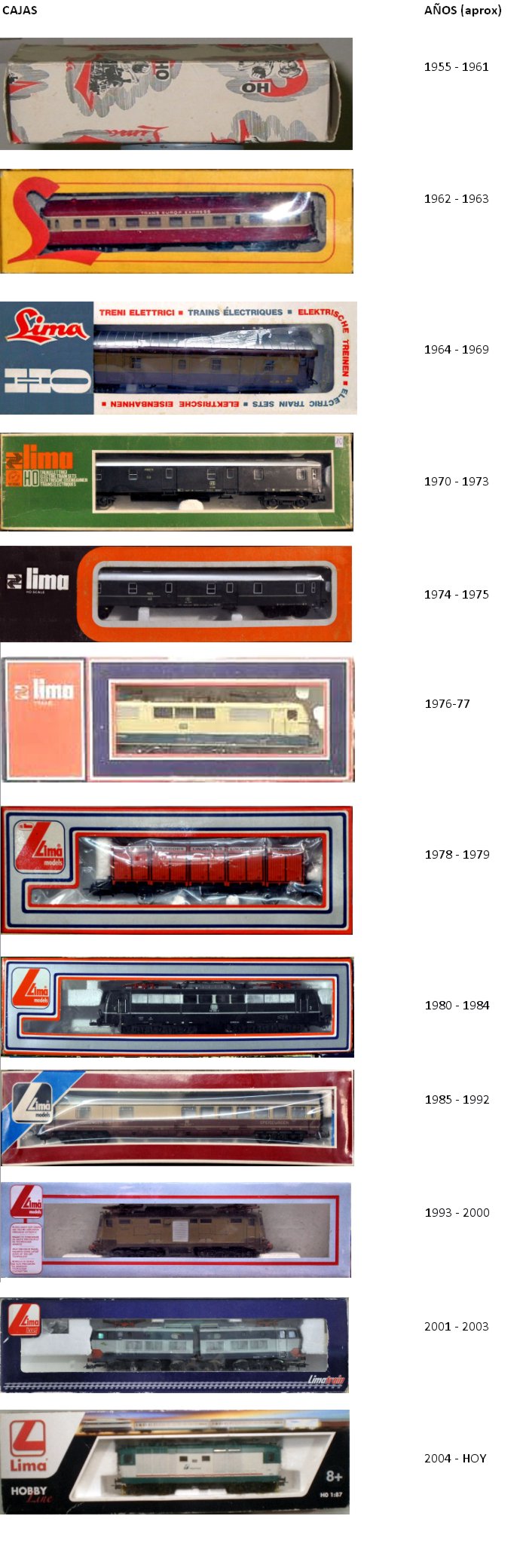 Uno schema che mostra come sono cambiate le scatole Lima, per modelli venduti singolarmente, nel corso del tempo. A diagrams that shows how the Lima boxes, for models sold singly, have changed over the course of time. |