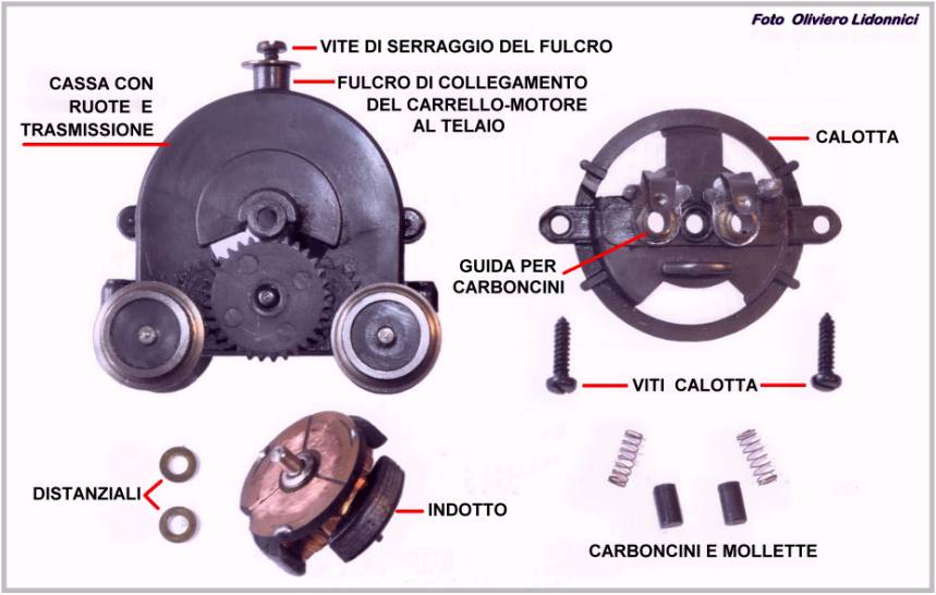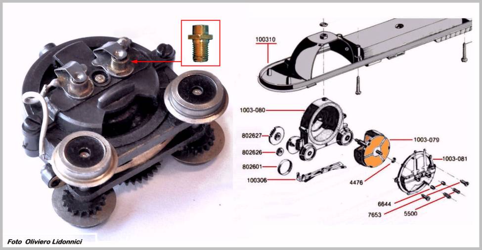 . Fig. 14 - Il carrello motore del TEE del 1964 e il disegno delle sue componenti. Questo disegno è tratto dal catalogo delle parti di ricambio del 1977: in esso si nota che alcune componenti sono già state rinnovate rispetto al prototipo del 1963/64. . Sempre nella Fig.14, nel rettangolo rosso è evidenziata una delle guide per i carboncini, smontata dalla calotta, ancora realizzata in ottone, tornito e filettato, ereditata dai precedenti motori “verticali”. Nelle varianti successive del motore G, questi elementi saranno sostituiti con economiche boccole in lamierino, rivettate direttamente nella plastica della calottina (1003-81): per questo particolare vedi anche Fig.17. .