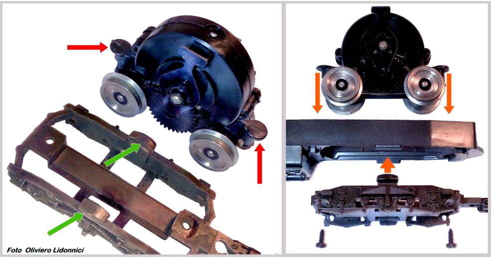 . Fig. 16 - Funzionamento del sistema “a perno virtuale” . Le frecce rosse (foto di sinistra della Fig.16) indicano le “orecchie” che poggiando sul telaio della locomotiva, limitano il movimento del carrello verso il basso, le frecce verdi indicano i pattini del falso carrello, su cui poggia il telaio, ovvero impediscono il movimento del carrello verso l’alto. Quando il falso carrello è avvitato al carrello motore, il telaio della locomotiva è vincolato tra questi quattro punti di appoggio (frecce arancioni a destra in Fig.16) il cui gioco permette una limitata ma sufficiente rotazione e oscillazioni del carrello stesso. Il baricentro virtuale di rotazione e oscillazione, si colloca su un piano ideale subito sotto le “orecchie” e poco al di sopra delle ruote: quindi si ottiene un sistema certamente più stabile di quello del TEE (art. 1003) del ’64, anche se occorre comunque notare che la rotazione è sempre accompagnata da una lieve traslazione sia laterale che longitudinale, determinata dalle necessarie tolleranze del sistema. La suddetta traslazione è comunque limitata e non compromette la funzionalità del complesso e non ne condiziona, in modo significativo, l’aspetto formale. . CONFRONTO TRA I DUE MOTORI .