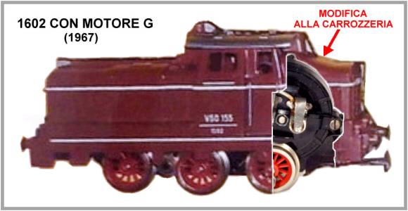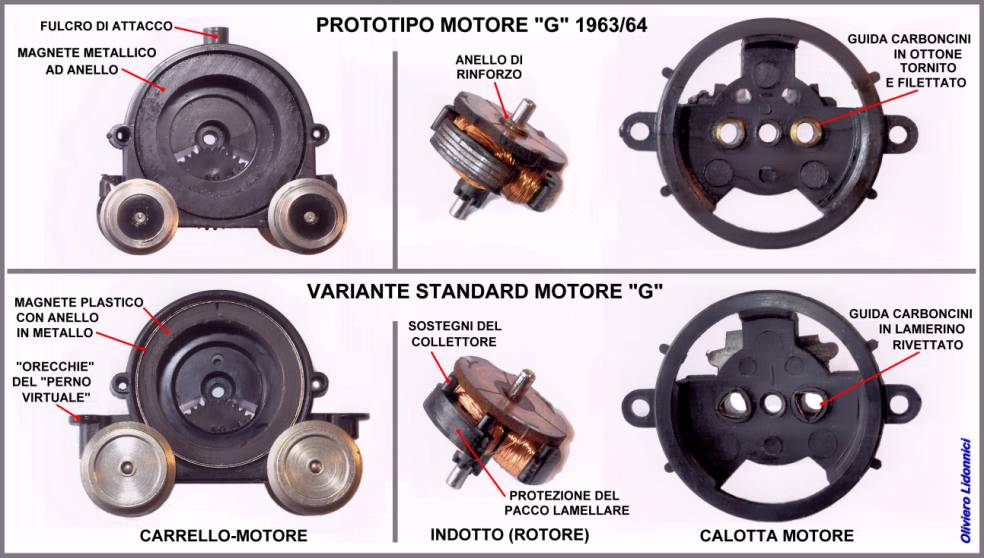 Quasi certamente il modello entrerà in produzione solo nel 1964 quindi possiamo ritenere questa la data di nascita del motore “G” che mantiene la stessa filosofia costruttiva dei precedenti, di integrare la distribuzione e il carrello col motore stesso ma, come vedremo, i primissimi motori “G” conservano anche altri elementi in comune con i precedenti propulsori, impostati sull’asse del rotore verticale. Nota: sui cataloghi non viene mai dichiarato apertamente che i motori sono di nuova progettazione ma, leggendo le didascalie di presentazione, si comprende quali sono i modelli col motore nuovo. A partire dal catalogo 1965, i modelli col vecchio propulsore sono definiti con le frasi: “Motore con buona potenza a voltaggio 9-12 V” oppure: “Motore con trasmissione a vite senza fine”. Invece i nuovi motori sono identificati con la frase: “Motore con ottimo funzionamento disposto orizzontalmente”. In base a quanto detto possiamo individuare, sul catalogo del 1964, altri due modelli movimentati dal nuovo motore: il locomotore olandese, serie 1200 (art. 8024) ed il locomotore italiano E 646 (art. 8026). .