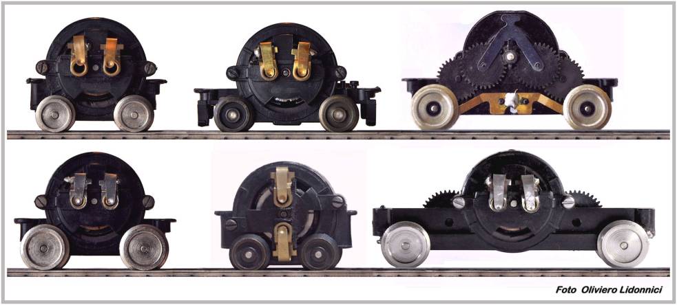 . Fig. 19 - Esempi di carrelli-motore a tre assi (nota: solitamente l’asse centrale è folle). . Quante siano queste varianti, attualmente non siamo in grado di quantificarlo con precisione, tenendo conto della vastissima produzione Lima nell’arco di mezzo secolo circa e dato che al momento della stesura di questo articolo (aprile 2017) disponiamo solo del catalogo ricambi del 1982/87 e parte di quello del 1977. . L’amico Pietro Merlo ha tentato di quantificare le varianti dei soli carrelli motori, degli anni Sessanta, con la limitata documentazione attualmente disponibile: . …Tralasciando per ora i modelli delle loco a vapore ed altre loco diesel ed elettriche con rodiggi particolari (Bielle, assi liberi ad esempio) proviamo a seguire gli sviluppi dell’impiego del motore G, appoggiandoci alle schede ricambi 1977 e 1982 … Nel 1964 il passaggio al centro di rotazione virtuale: Primo il locomotore olandese NS 1200 art 8024 (novità sul catalogo1963) il cui carrello motore a tre assi (folle il centrale), nelle schede 1977, 8024-080 (dal 1982 riclassificato 8042-537 rapporto supertrazione*), verrà poi utilizzato da Lima anche per parecchie loco australiane, americane, inglesi e scandinave rodiggio Co-Co. Sempre nel 1964/65 il nuovo E646 FS: nasce la motorizzazione G nella versione carrello a due assi destinata anche a moltissime loco Bo-Bo, Bo-Bo-Bo e B-B italiane, francesi, belga, ed in seguito tedesche, svizzere, austriache, svedesi, sudafricane etc.… e individuata nelle schede 1977 come 8022-080 (dal 1982 riclassificata 8026-536, rapporto supertrazione). Nel 1965/66 la SNCF CC 40100 art 1022( poi 8122) porta allo sviluppo di un nuovo tre assi a passo corto e ruote di piccolo diametro(sempre folle l’asse centrale) individuata nelle schede del 1977 come 1022-080,utilizzato per altre loco francesi rodiggio CC ed anche, eliminando l’asse folle centrale, come carrello motore numerose loco ed automotrici con carrelli a due assi come evidente dalle schede 1982 ove sarà riclassificato 1022-537 quando a tre assi e 1022-536 a due, entrambi supertrazione).