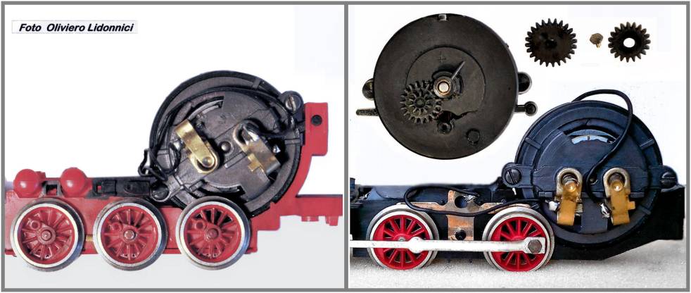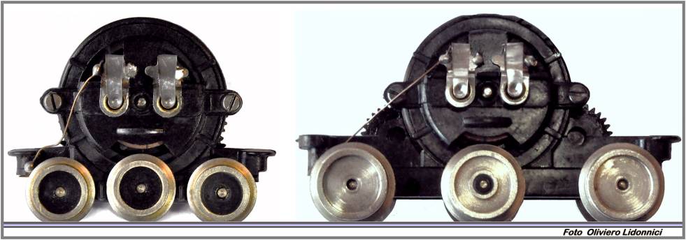 . Fig. 17- Diversi elementi costruttivi caratterizzano il motore standard dal prototipo: in particolare si notino le differenze tra i due indotti. . I nuovi motori non hanno più alcun elemento comune con i motori “verticali” quindi si può desumere che siano stati commercializzati in un tempo successivo (anche se di poco: 1965?) a quello del TEE. Verranno subito dopo affiancati da ulteriori, numerose, varianti, differenziate dalla combinazione di molti parametri tra cui: diametro ruote, numero degli assi, passo, diversa composizione della trasmissione, posizione delle linguelle pressa-mollette, posizione delle sedi delle viti della calotta, diversa altezza sul piano del ferro delle “orecchie” e anche differente avvolgimento del rotore per diversa tensione: 9/12 volt oppure 4,5/9 volt per gli start set (almeno dei primi anni di produzione). .