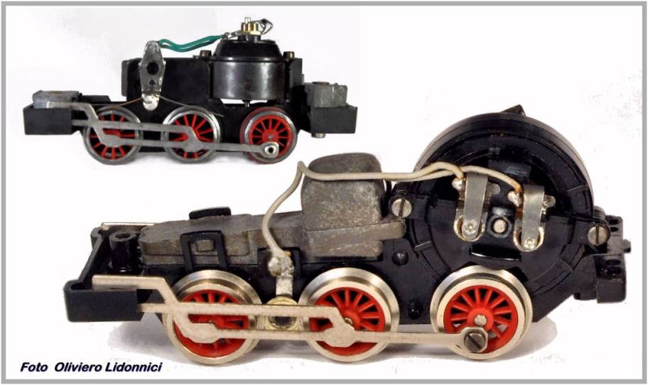 . Fig. 25 - Esempio di differenti versioni del motore G nei modelli delle locomotive a vapore. A destra il telaio della BR80 (art 1700 del 1974) a sinistra la 0-4-0 Alco (art. 3006 del 1971) Le casse dei due motori hanno attacchi invertiti e le calotte sono diverse.