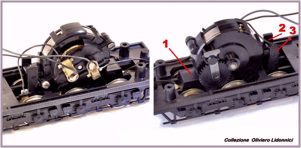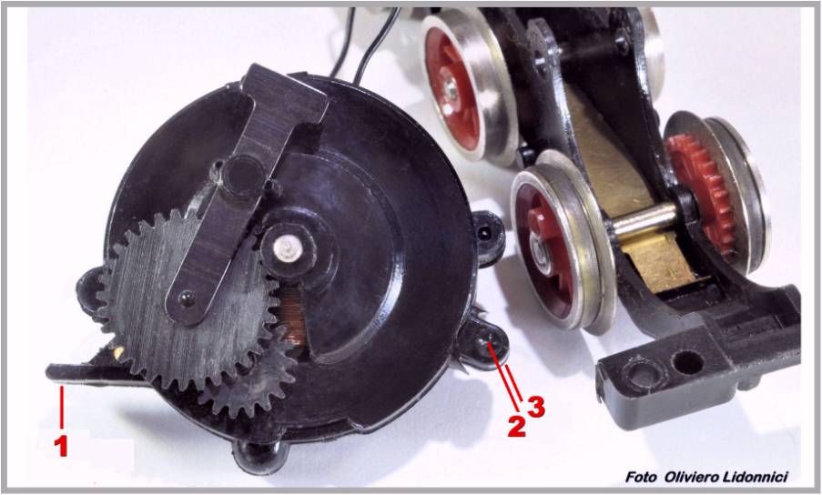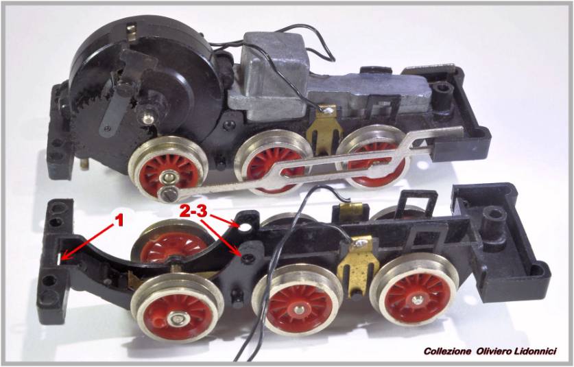 . Fig. 24 - I tre punti nei quali il motore viene incastrato a pressione* nel telaio. *Si inserisce “a baionetta” nella fessura 1 poi si pressa sulle linguelle 2 e 3 fino all’incastro dei perni La plastica molto elastica del telaio, facilita l’inserimento e blocca il motore una volta in sede. . Sebbene il motore impiegato sulle locomotive a vapore, essendo completo di tutte le sue componenti, sia teoricamente intercambiabile su modelli diversi, a causa di problemi di ingombro e di differente trasmissione, come per i carrelli-motore, se ne produrranno ugualmente numerose versioni (vedi alcuni esempi nelle figure 25 e 26) .