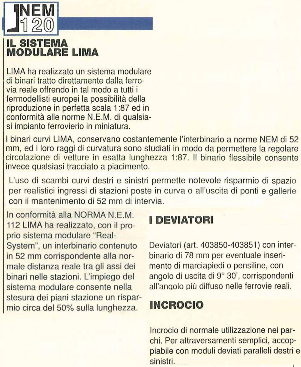 1989 Vengono presentati i nuovi binari Nem 120 che ricomprendono le novitą del catalogo precedente. Anche questi si differenziano per il codice: Nem 120 40-38xx, quelli in Nickel-Silver 40-39xx, quelli standard 40-30xx. Gli standard resteranno a catalogo fino al1991
