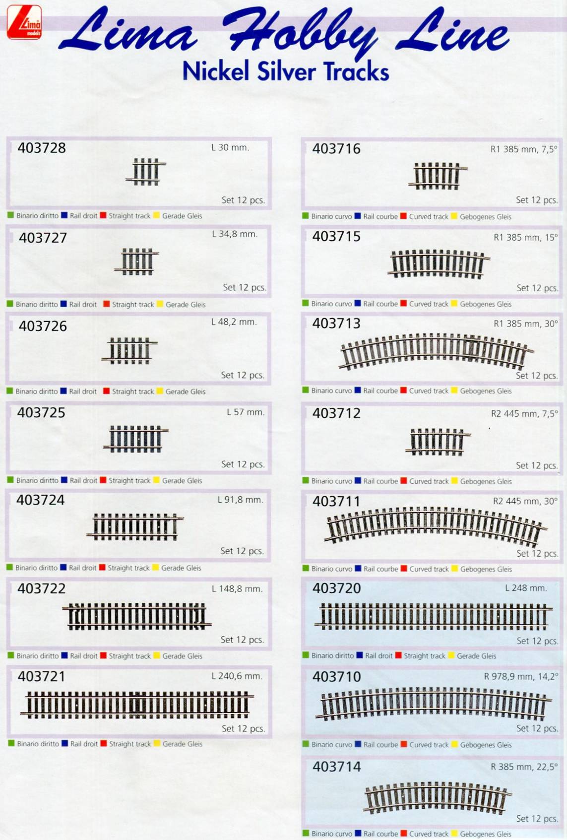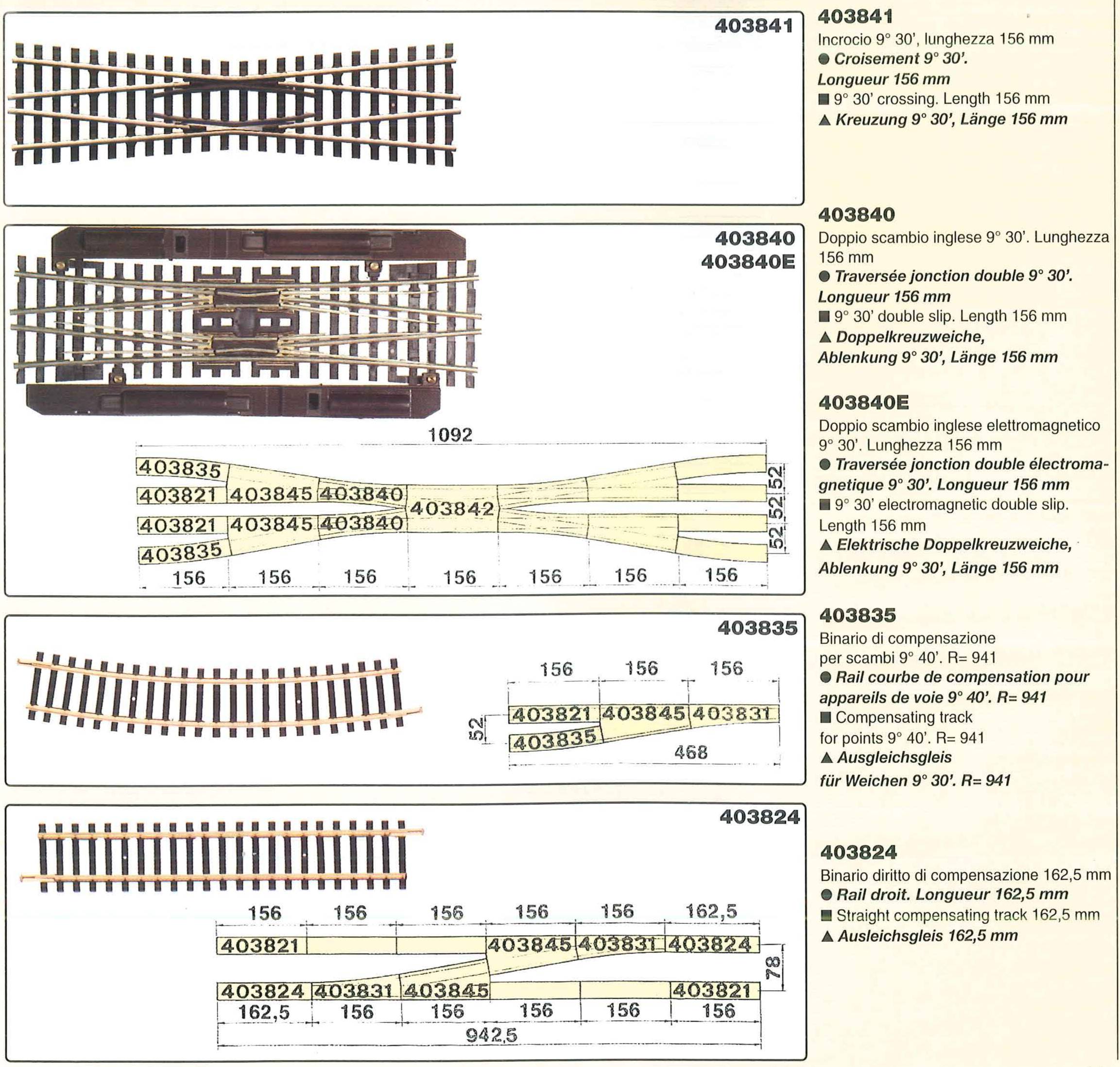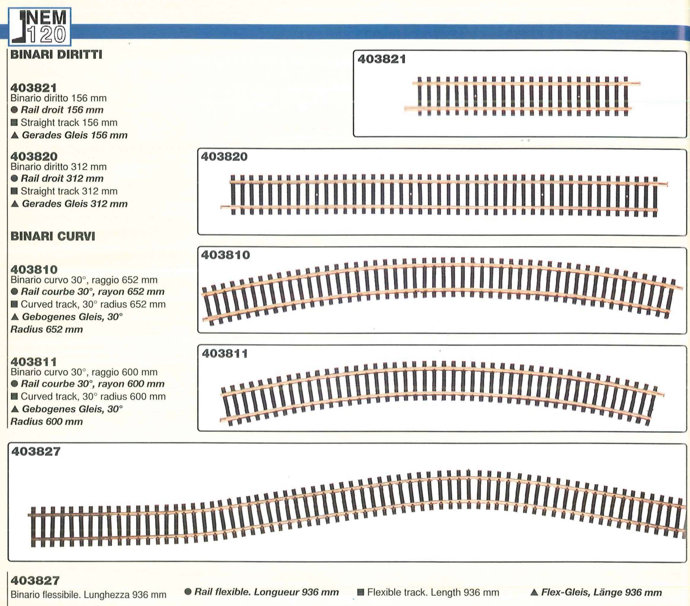 1998 I binari non vengono pił identificati come NEM 120 o Nickel-Silver e cambiano codice: ora 4037xx che ricomprende tutti i binari proposti