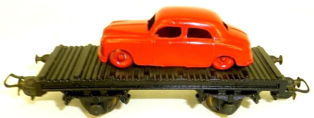 Articolo 181 (1954) – Pianale FS a due assi con carico di tubi e scarico automatico I tre tubi metallici, appoggiati su due supporti inclinati, venivano lasciati liberi di cadere quando la barra laterale sporgente dal carro veniva spinta. Insieme al carro era fornita una vaschetta metallica da appoggiare al binario per ricevere i tubi scaricati; la vaschetta era disponibile con un lato adattabile al binario Märklin o a quello Rivarossi
